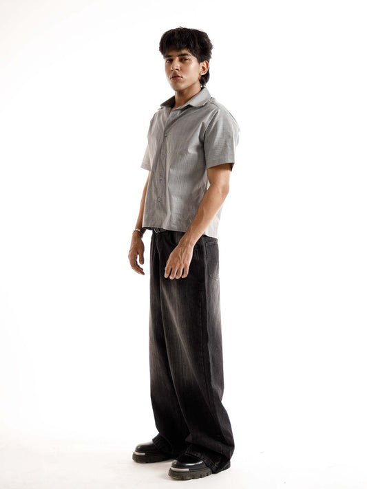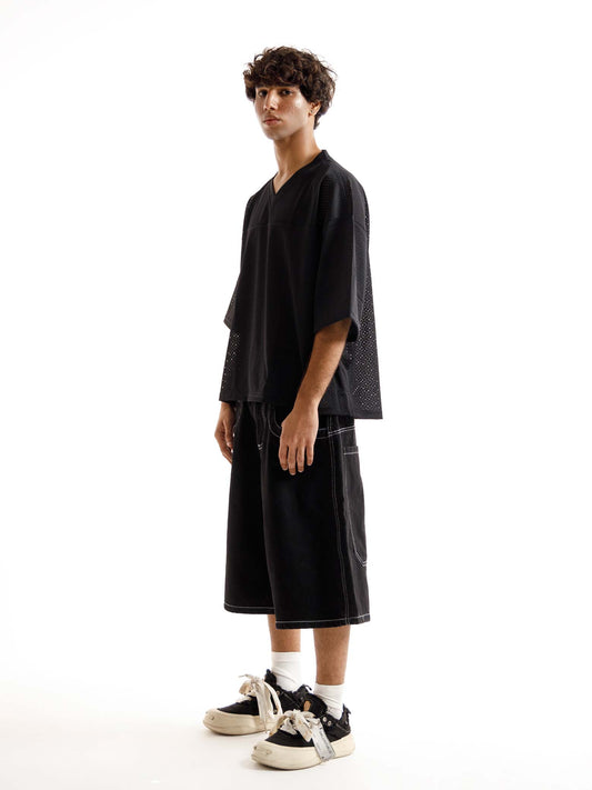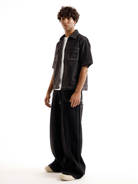 BLACK SHORT SLEEVES CROSS STITCH DOUBLE POCKET BOXY SHIRT